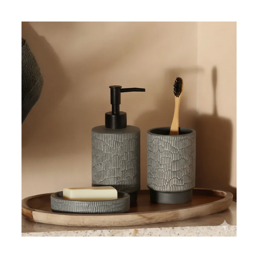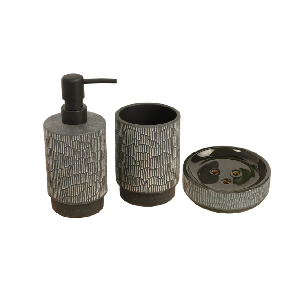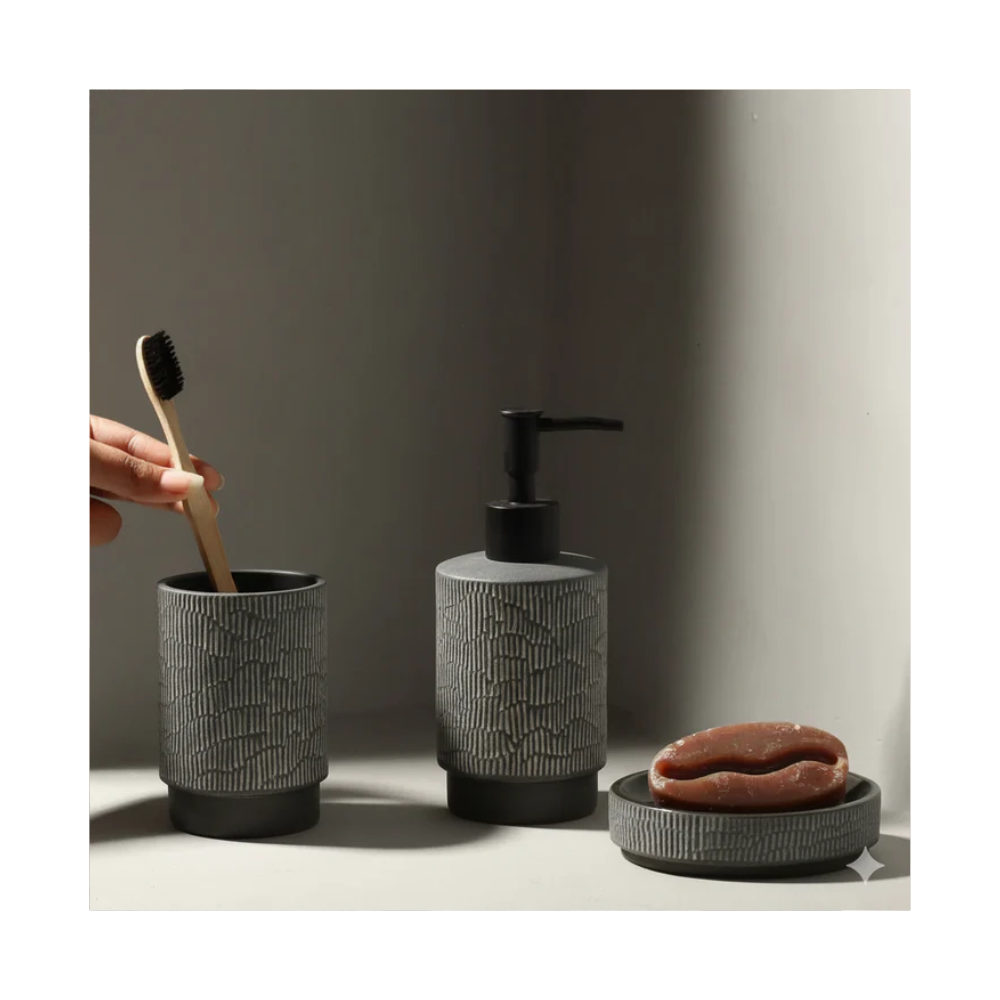 Transformă baia într-un spațiu elegant cu acest set format din dozator, suport pentru periuțe și săpunieră. Realizat din ceramică de calitate, cu model texturat alb-negru și detalii în nuanțe mate, setul îmbină stilul contemporan cu funcționalitatea. Este soluția ideală pentru a adăuga un accent rafinat și practic oricărei băi.