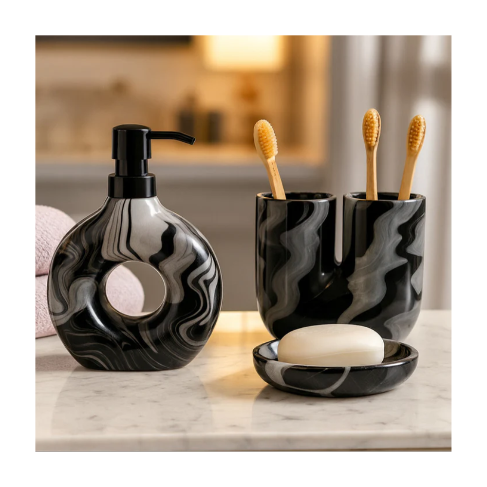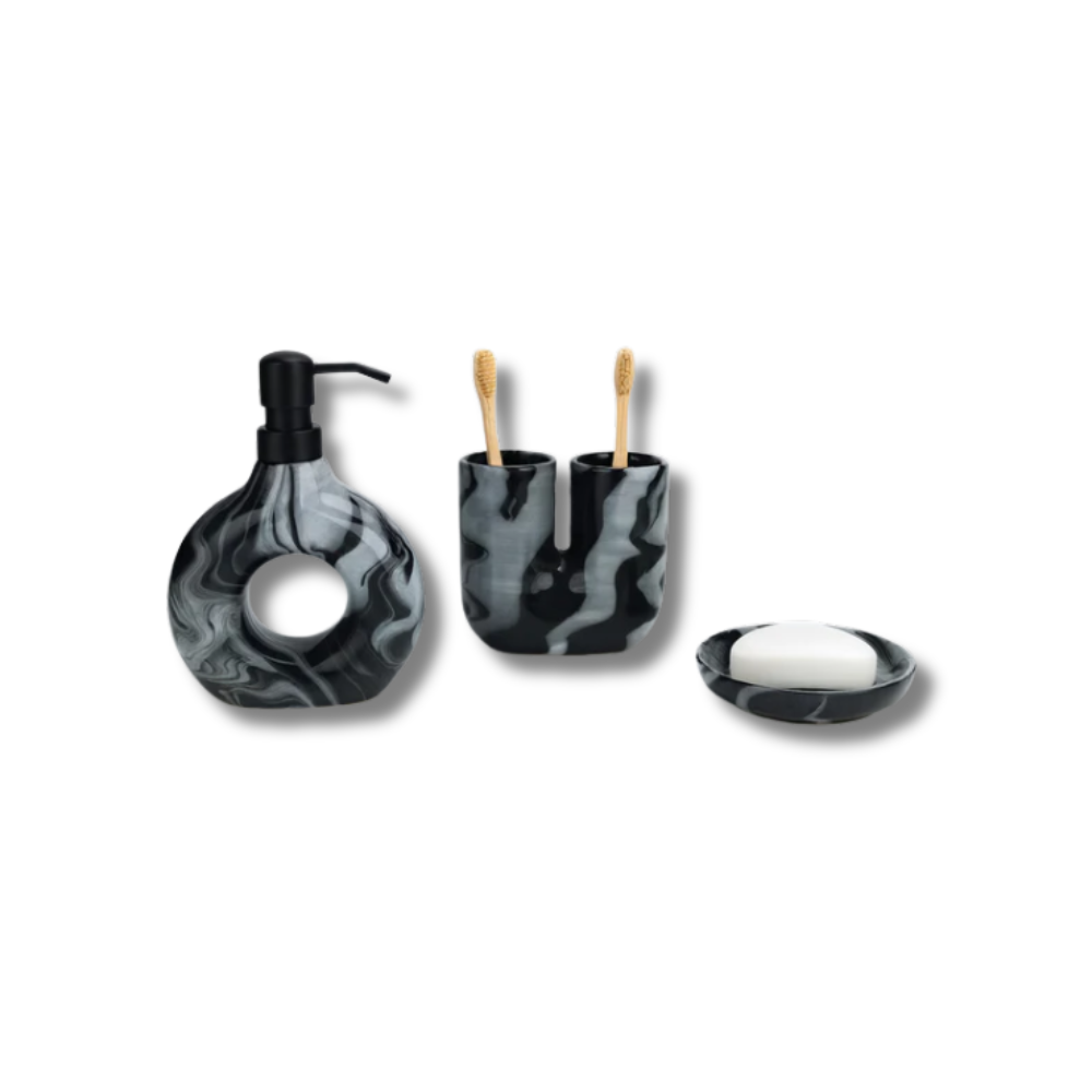 Adu un plus de rafinament în baia ta cu acest set de accesorii cu finisaj marmorat, în tonuri elegante de negru și gri. Fiecare piesă este concepută pentru a îmbina funcționalitatea cu stilul contemporan, transformând spațiul într-un colț sofisticat.