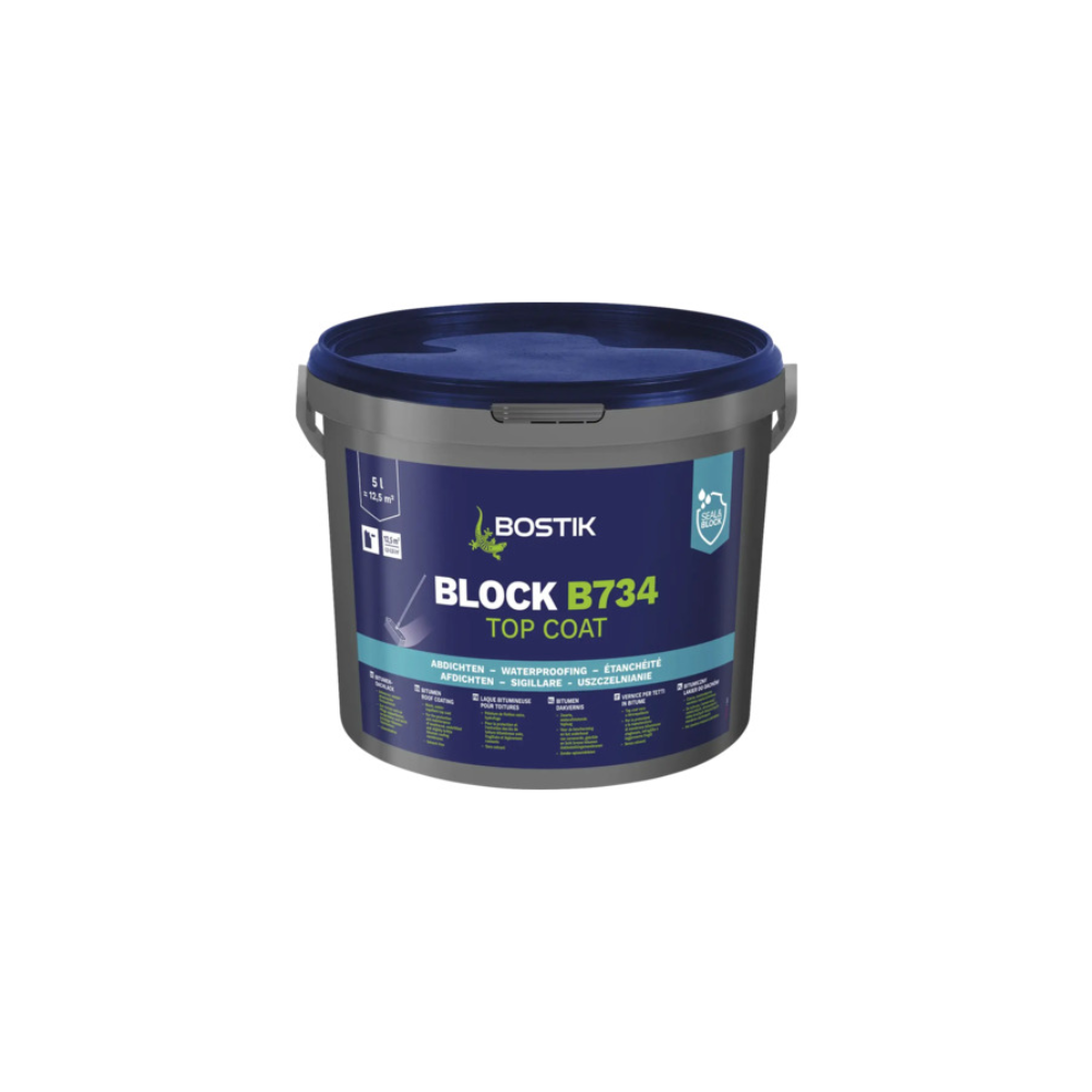 Hidroizolația pentru acoperiș Bostik Block B734 5 litri este un strat de finisare negru hidrofug pe bază de bitum, pentru protecția și întreținerea membranelor de acoperiș din bitum care au fost afectate de intemperii, îmbâcsite și ușor fragile. Pelicula protectoare bine uscată este hidrofugă, nu devine casantă și este rezistentă la substanțele agresive pentru beton care apar în mod natural.