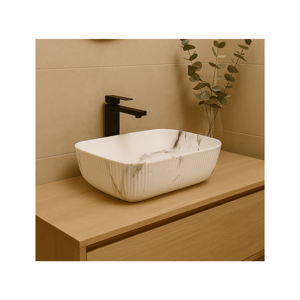 Textura exterioară cu striații verticale conferă un detaliu unic și elegant, transformând lavoarul într-o piesă de accent în decorul băii. Dimensiunile de 470x335x140 mm îl fac potrivit atât pentru băi moderne, cât și pentru spații de inspirație clasică.