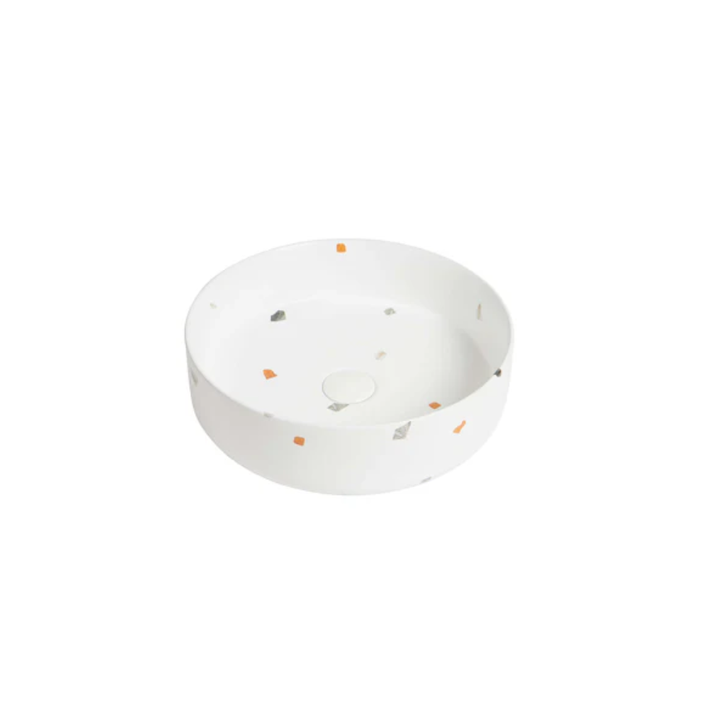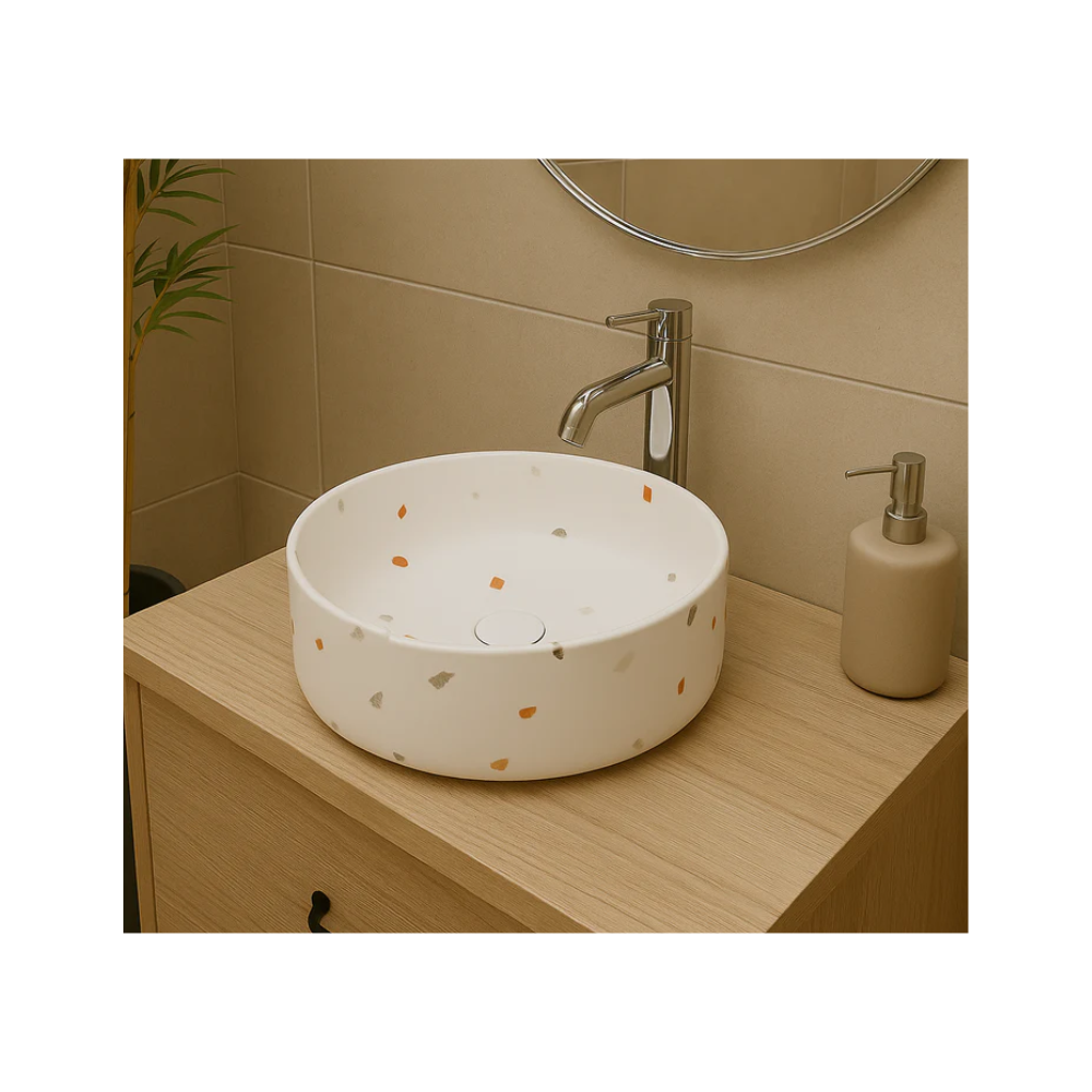 Lavoarul pe blat A524-DC01 este o piesă de design contemporan, ce aduce un plus de personalitate și stil oricărei băi. Realizat din ceramică de înaltă calitate, acest model se remarcă prin finisajul său terrazzo, decorat cu mici inserții colorate în nuanțe calde și neutre, ce creează un efect vizual unic.