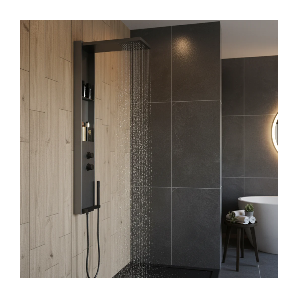 Panelul de duș Gun Metal se remarcă prin designul minimalist și finisajul modern, aducând un aspect premium și echilibrat în baia ta. Liniile sale simple completează perfect decorul unei băi contemporane, oferind o atmosferă de eleganță și rafinament.